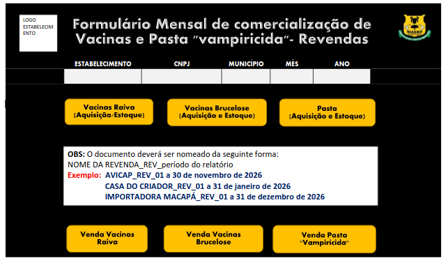 Art. 4º. Para as vacinas de brucelose de bovinos e bubalinos e raiva dos herbívoros domésticos e produtos ?vampiricidas?, as revendas agropecuárias deverão enviar formulário de controle de aquisição, venda e estoque à Diagro, mensalmente (até o quinto dia útil do mês subsequente), no formato digital, pessoalmente ou por meio eletrônico oficial determinado pela agência.